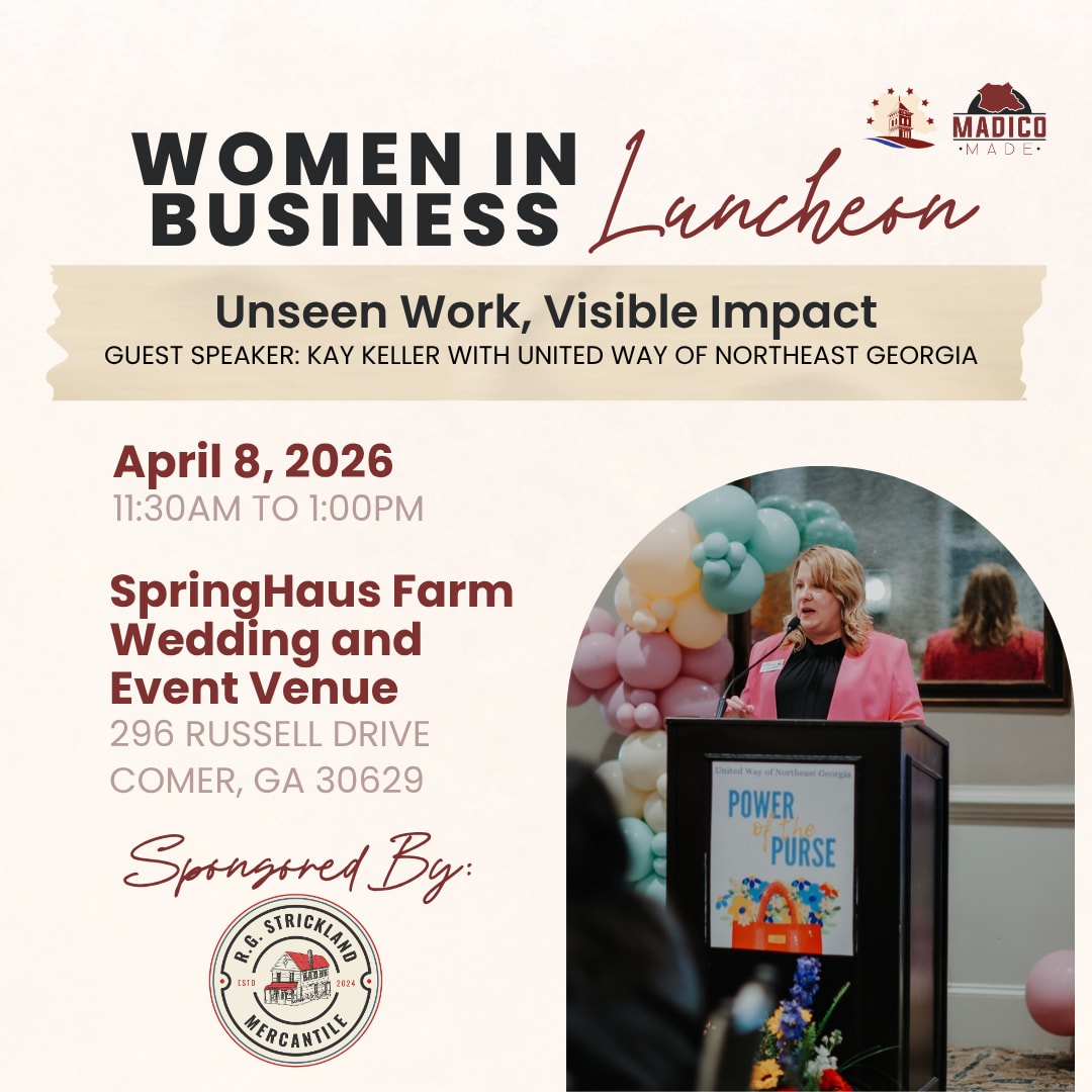 Join us for an inspiring Women in Business Luncheon on Wednesday, April 8th at SpringHaus Farm Wedding & Event Venue. Networking begins at 11:30 AM, followed by a thought-provoking program facilitated by Kay Keller, President and CEO of United Way of Northeast Georgia.