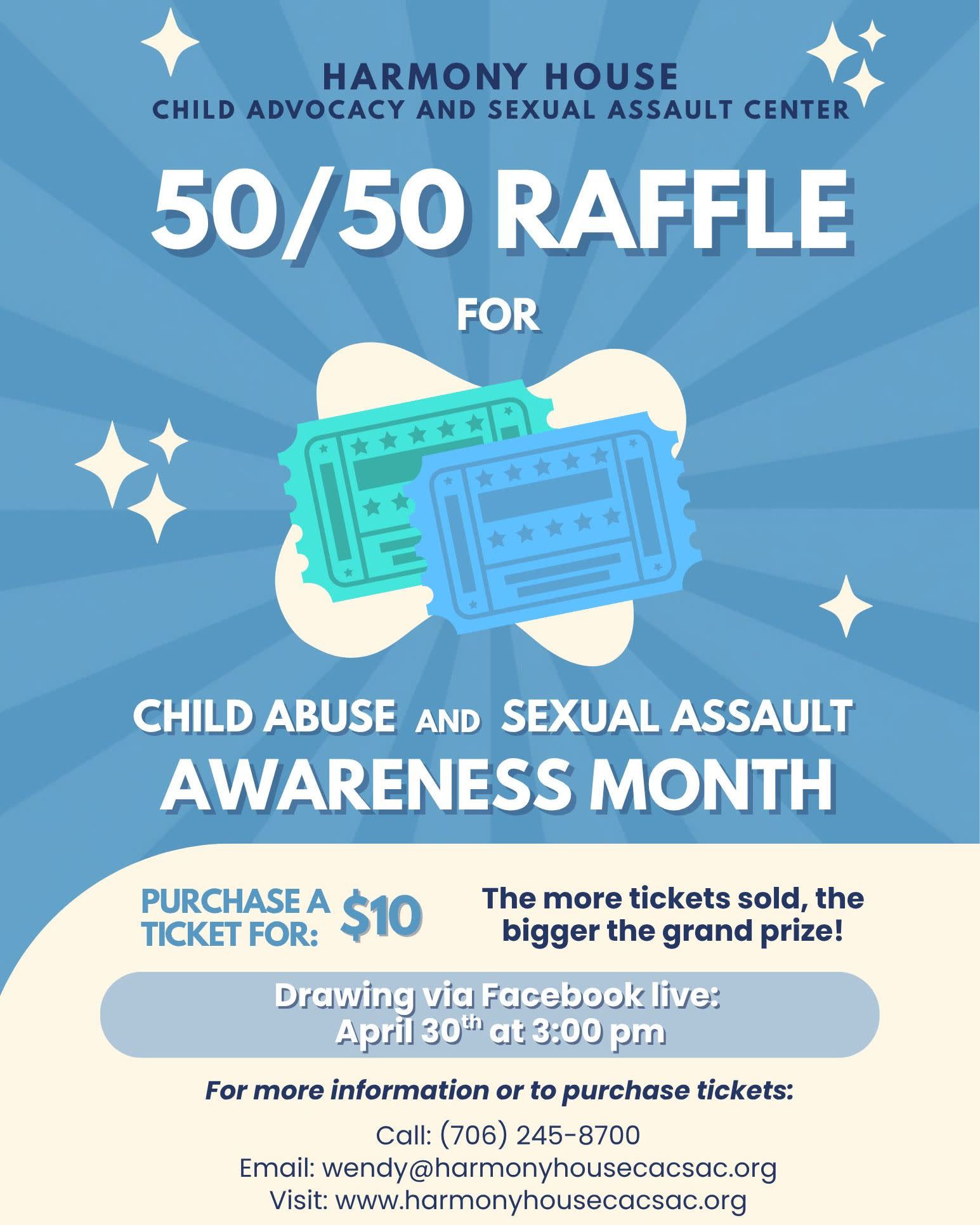 DESCRIPTION:Harmony House Child Advocacy Sexual Assault Center will be holding its annual Awareness Month 50/50 Raffle Fundraiser throughout April in honor of Child Abuse Prevention and Sexual Assault Awareness Month. The winner of the raffle will be announced via FB Live at 3 PM on April 30th. Tickets are $10 each\, and the winner will receive   of the overall sale total. Get your ticket now by calling (706) 245-8700 or stopping by the Royston or Elberton Harmony House Child Advocacy Sexual Assault Center offices. Proceeds benefit survivors of child abuse and/or sexual assault in the Northern Judicial Circuit\, consisting of Elbert\, Franklin\, Hart\, Madison\, and Oglethorpe Counties.